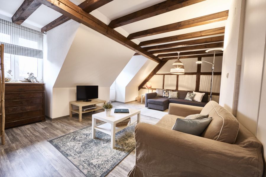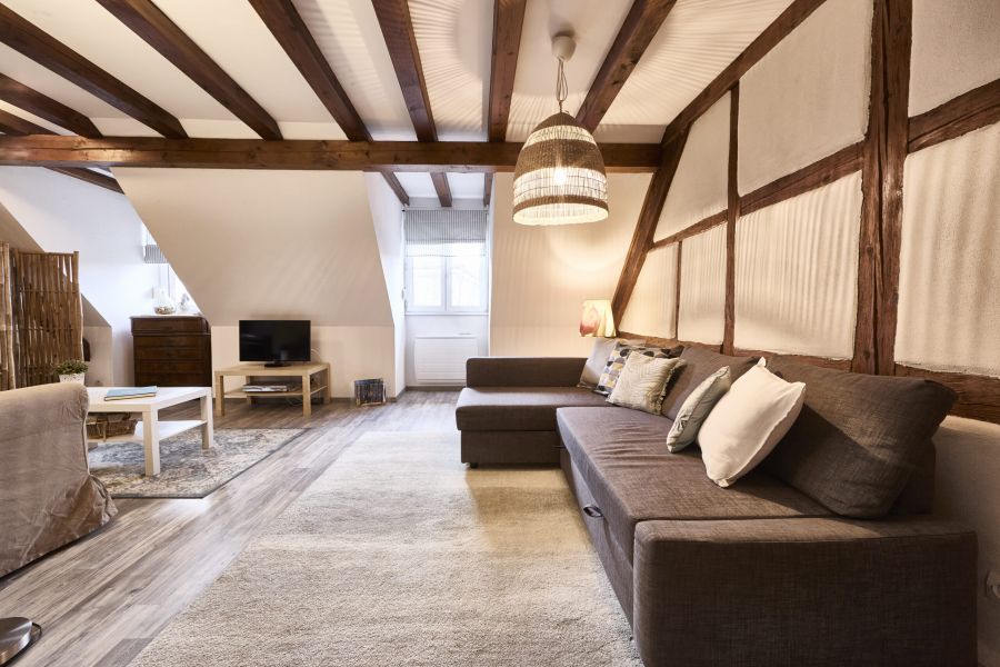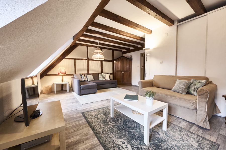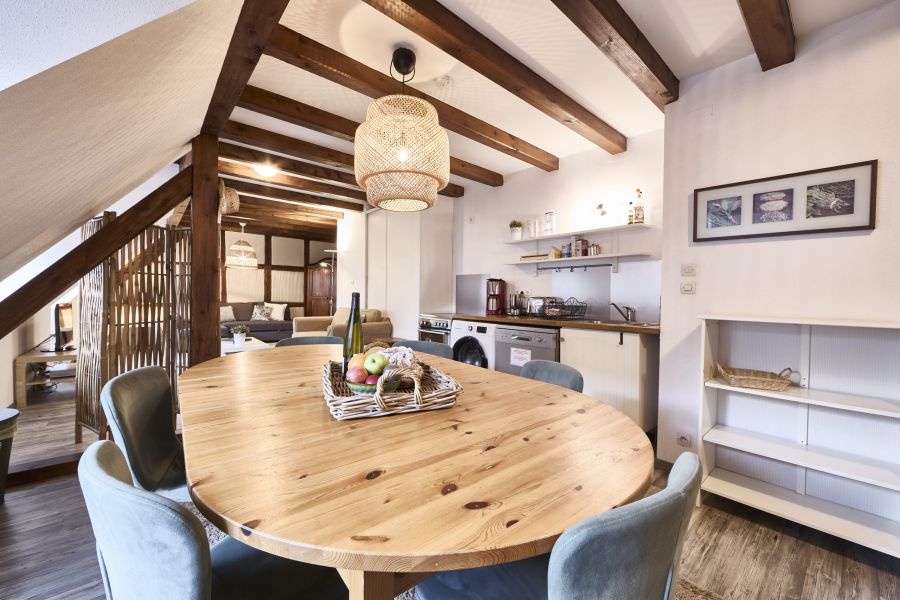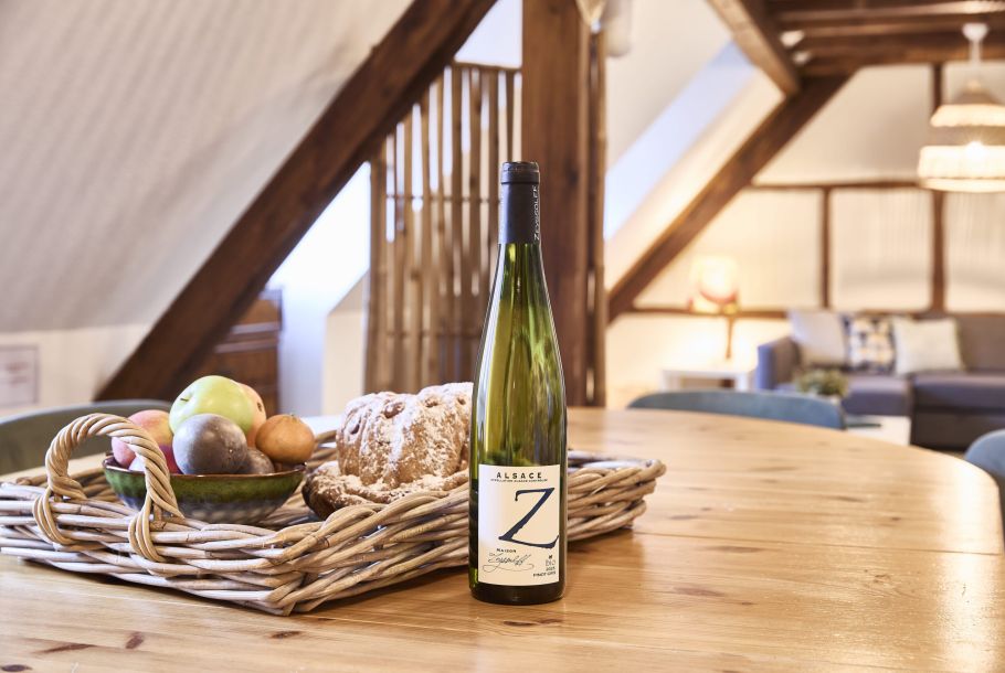 Le gîte Charlotte est un gîte de 110m² pour 6 personnes situé au premier étage, dans les combles de la cave viticole ZEYSSOLFF. Il dispose d’un chauffage électrique et d’une climatisation individuels. Ses poutres apparentes associées à des tons blanc et taupe font de cet appartement un gîte authentique et moderne. Il possède une petite entrée avec un placard. Une salle de séjour avec TV-écran plat et lecteur de DVD, canapés et fauteuils vous invitent à la détente. Un coin cuisine tout équipé est à votre disposition (lave-vaisselle, lave-linge et sèche-linge, micro-ondes, frigo-congélateur, plaques vitro et four). 2 chambres indépendantes sont composées chacune de 2 lits, plus 1 chambre indépendante composées d’un grand lit avec salle de bain (douche). Seconde salle de bain avec douche et toilettes. Des toilettes indépendants. Un dressing de 9m².