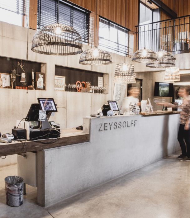Eager to transmit their passion for wine, Céline et Yvan ZEYSSOLFF chose to create a cultural and entertaining space in the family’s original wine cellar. This space brings to life objects of the past via a contemporary decor, uniting scenography, tasting, shop and bar.