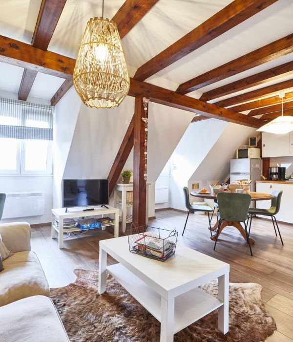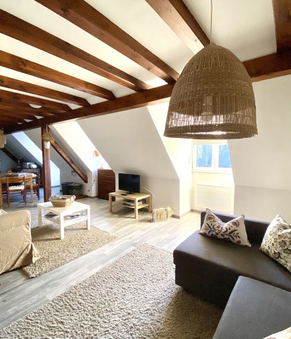 The Opaline cottage is a 75m² cottage suitable for 5 people, located on the first floor, in the converted loft of the ZEYSSOLFF wine cellar. It is heated by individual electric heating.