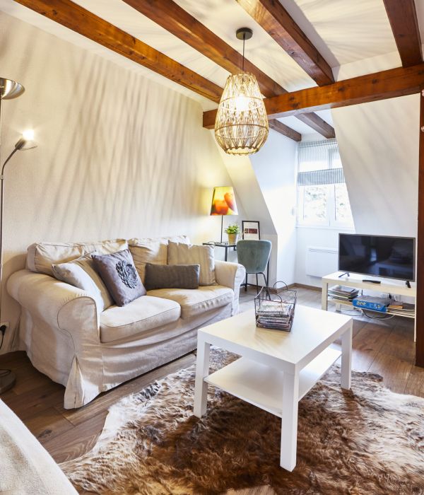 The Ophelia cottage is a 60m² cottage suitable for 3 people, located on the first floor, in the converted loft of the ZEYSSOLFF wine cellar. It is heated by individual electric heating.